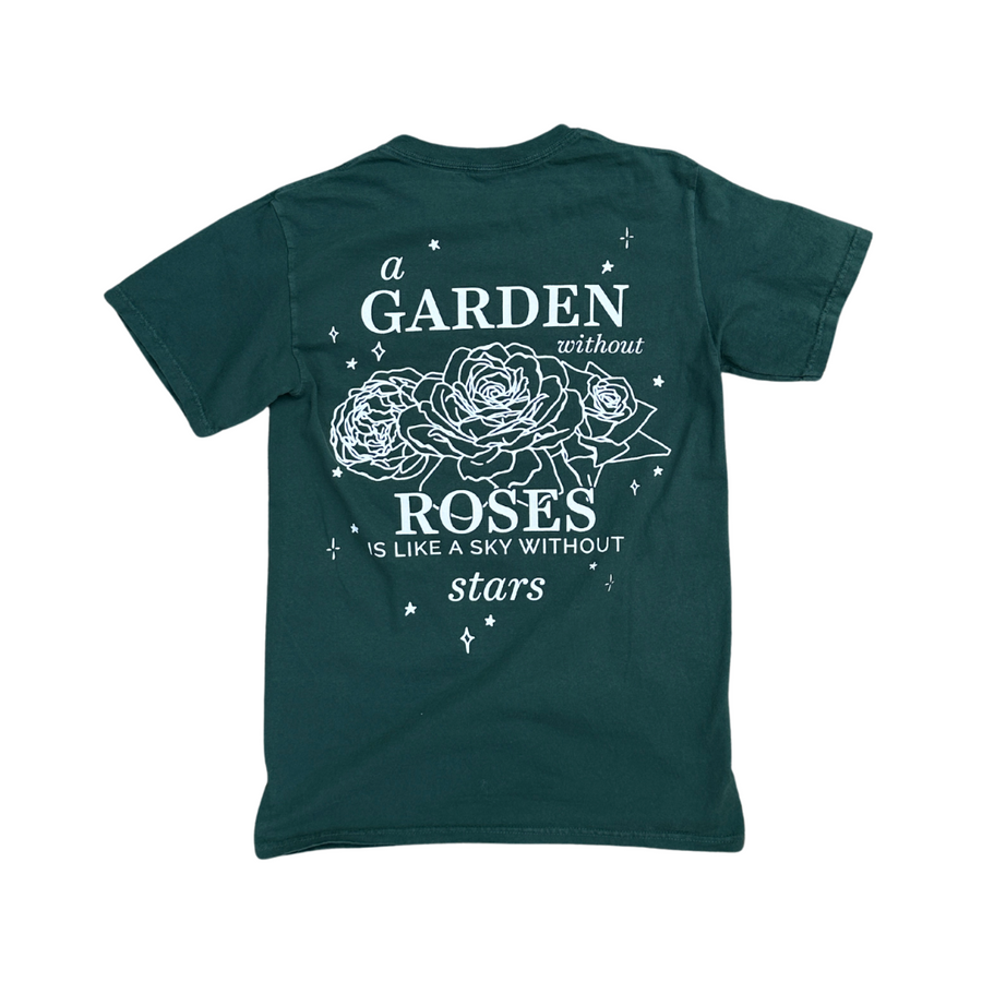 Back of shirt: "A Garden without Roses is like a Sky without Stars"