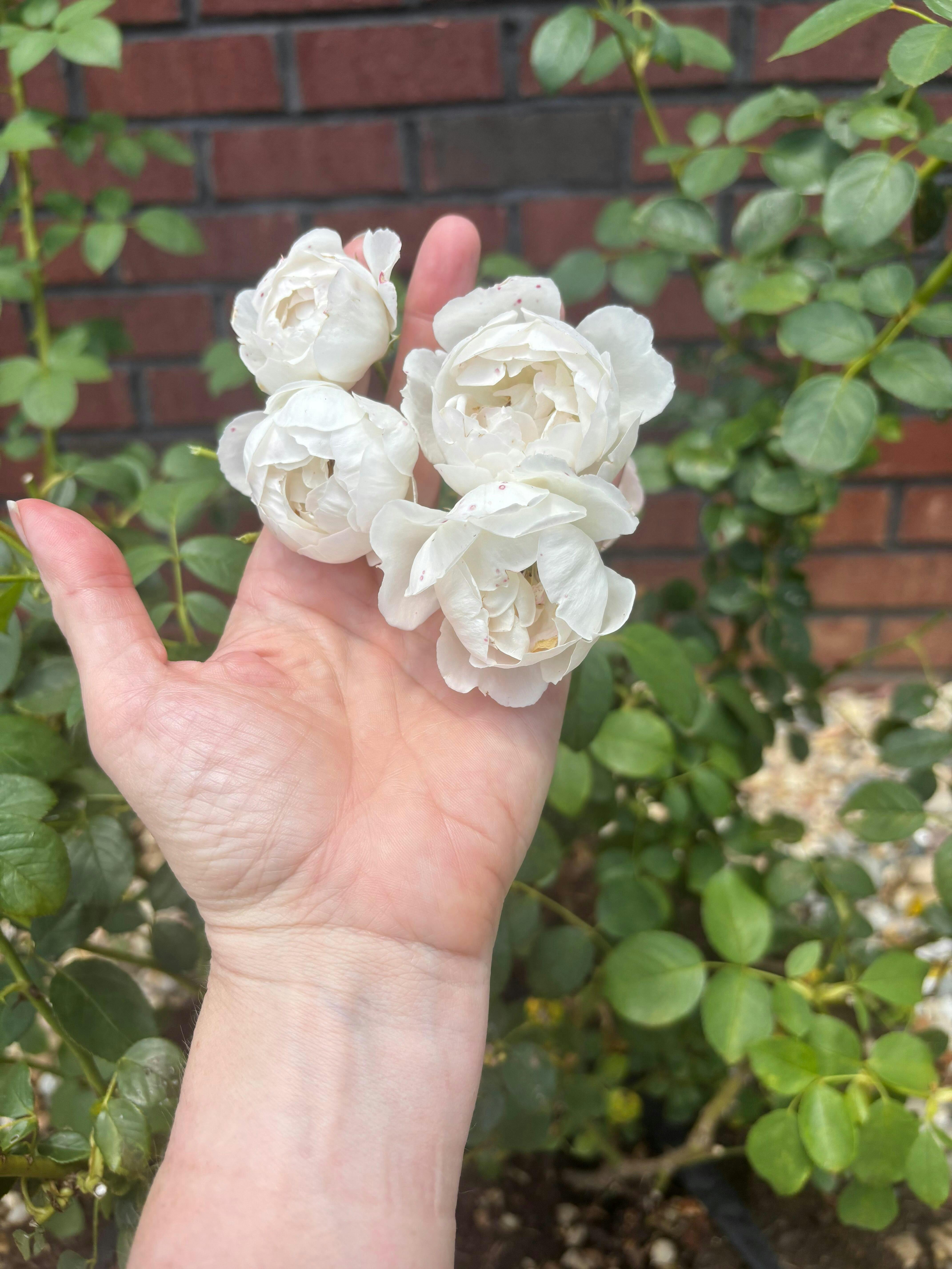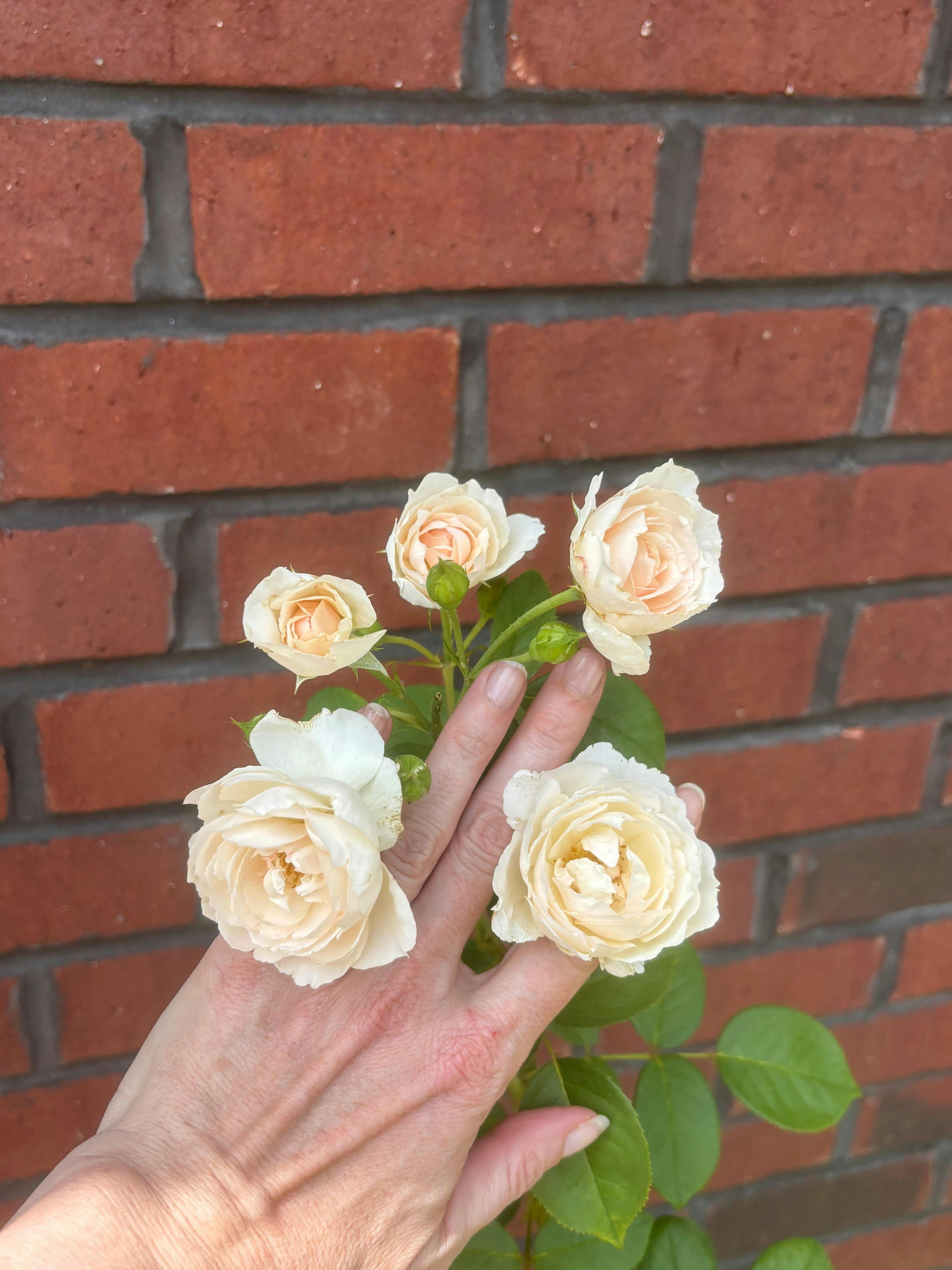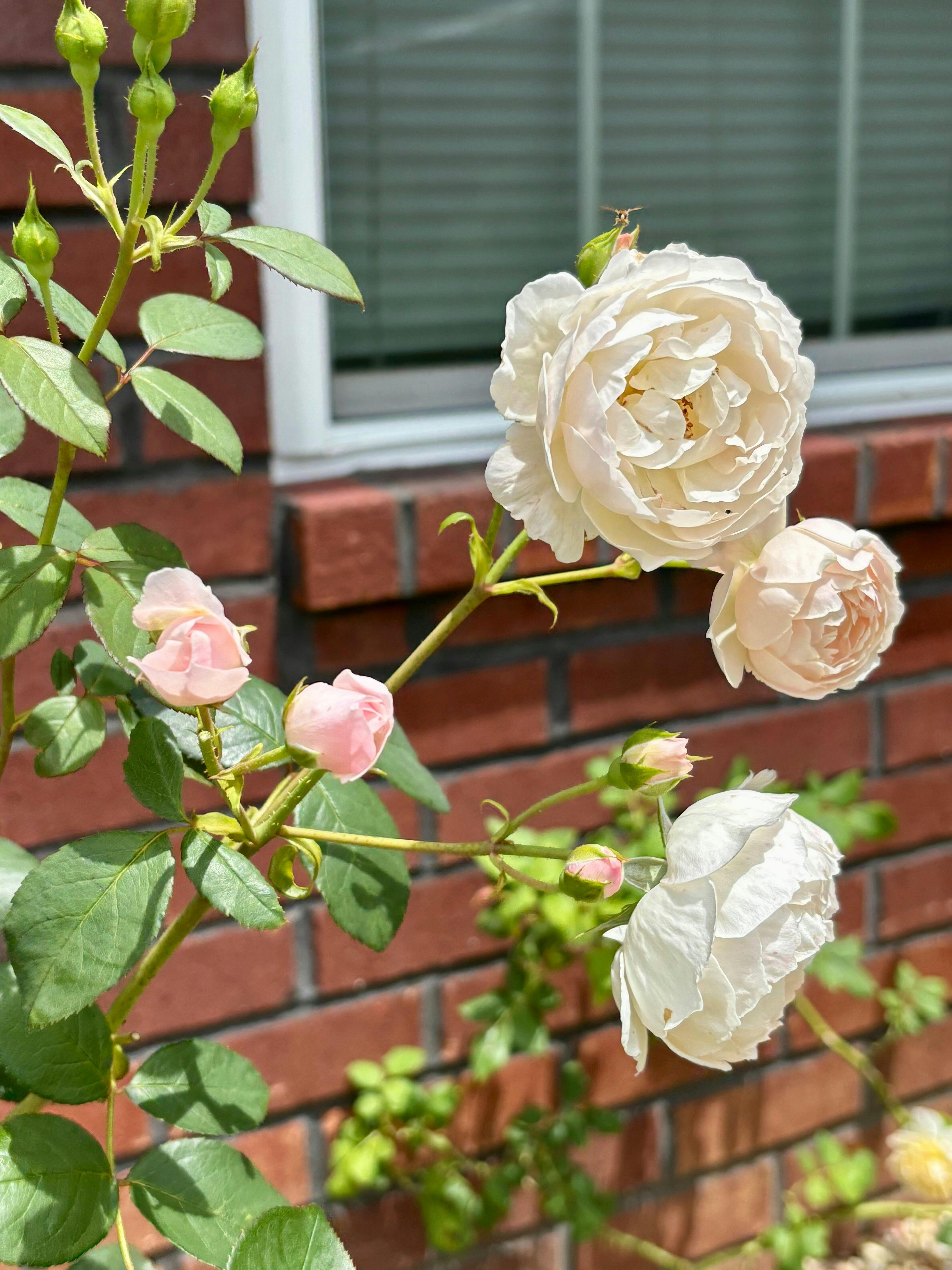 Like my Roald Dahl, I didn’t thoroughly research this rose before adding it to my garden, Desdemona blooms in clusters of very small blossoms, fading from blush to white as they open. She doesn’t have the high petal count I expected from a David Austin rose, but her cup shaped flowers are dainty and feminine. In the humidity of the south, she requires regular fungicide treatment to prevent black spot. With her clusters of little flowers, she behaves a lot like a spray rose.