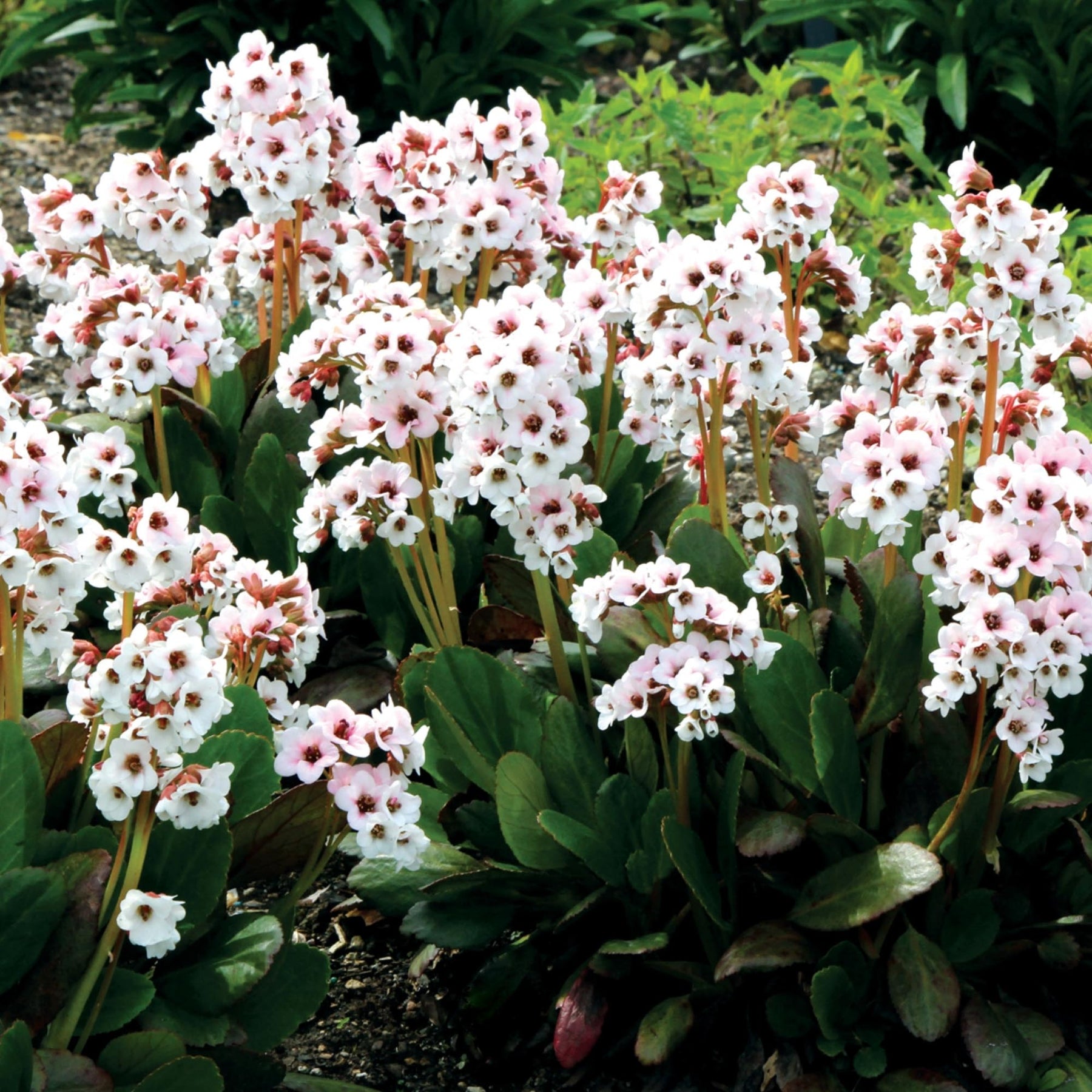Dragonfly Angel Kiss is a compact Bergenia featuring semi-double, white flowers that mature to light pink in early spring. Its glossy, dark green foliage turns deep wine-red in winter, providing year-round interest. Reaching 10-15 inches tall, it thrives in full sun to partial shade and well-drained soils. Hardy in zones 4-9, it's ideal for borders, groundcover, and containers.