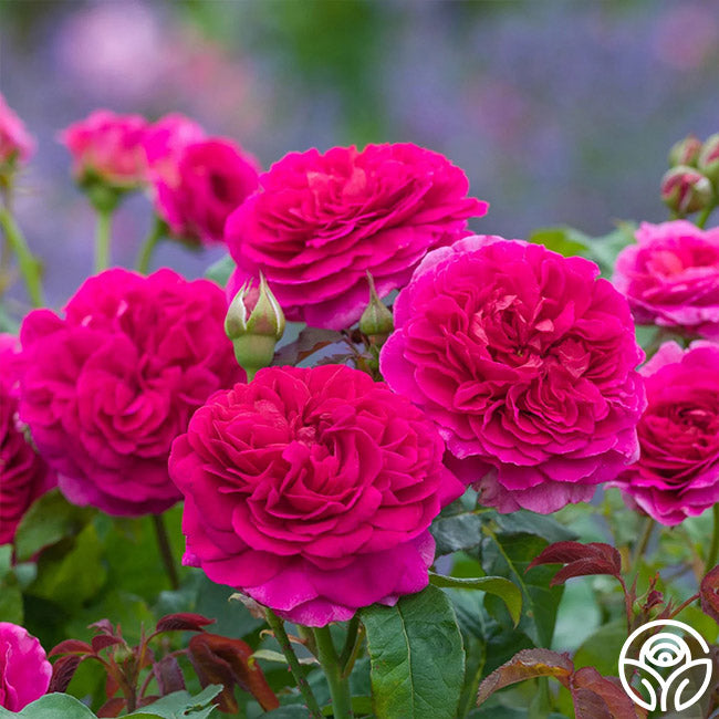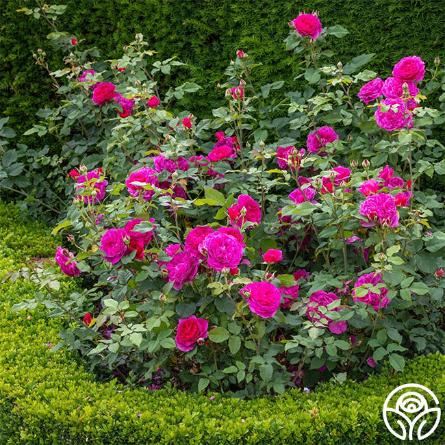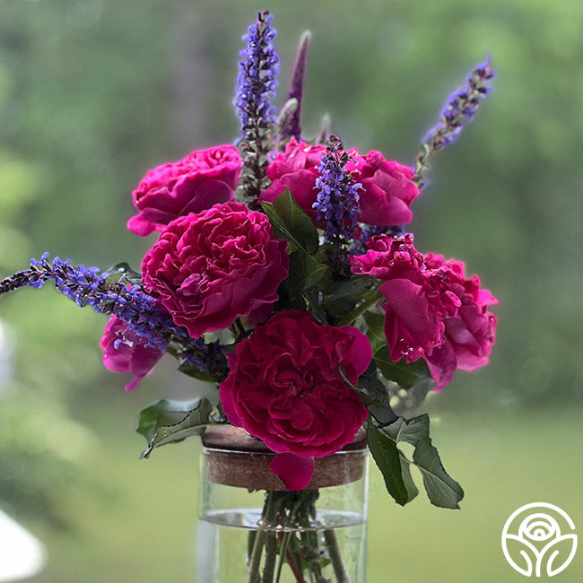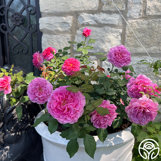 A delightful David Austin rose, Gabriel Oak™ has bright pink to fuchsia flowers with up to 125 petals tightly packed in rosette form. As the buds open, the outer petals lighten but the intense fruit fragrance remains strong. The singular blooms open so wide they nearly reach back to touch the deep-colored canes. This is a vigorous-growing rose that keeps a tidy habit at about 4’ x 4’ with large 3 ½” to 4” blooms.