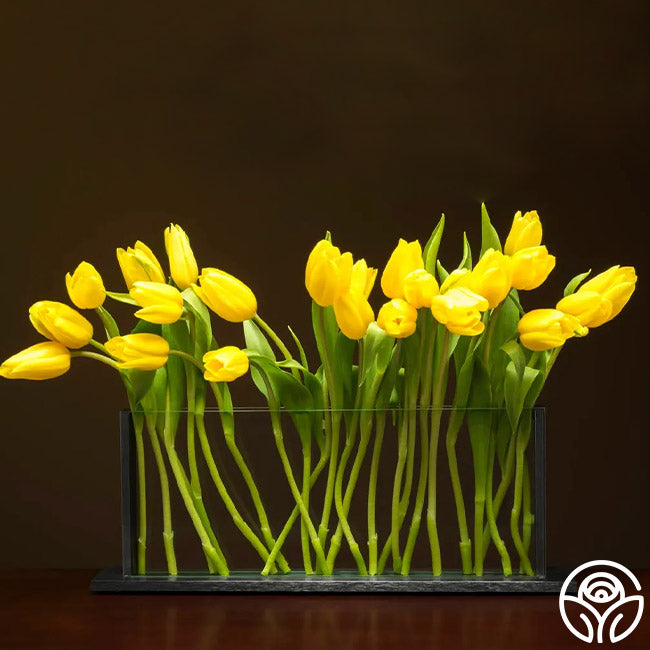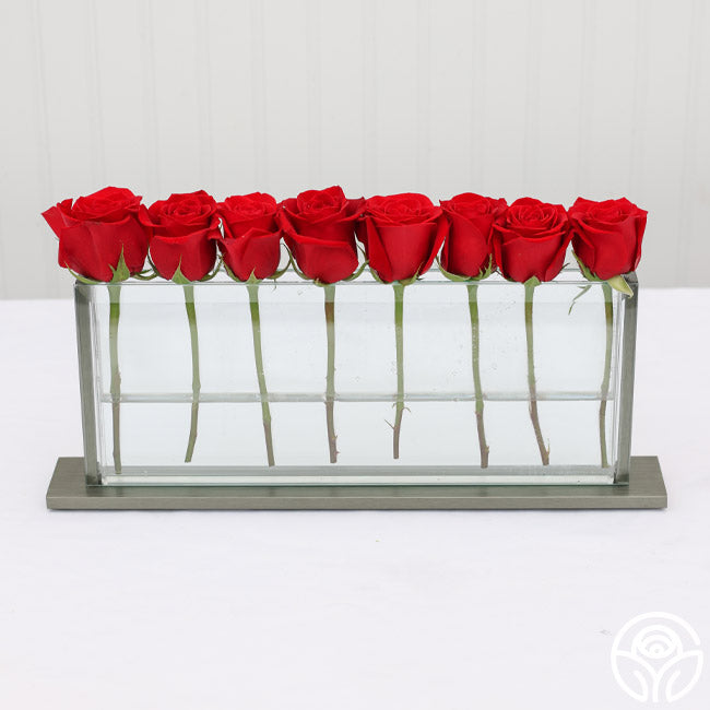 Every cut flower gardener needs this vase. Our Still Life Vases extend the vase life of all of your cut flowers with a patented, microbial-resistant, and leak-proof liner. The clear acrylic liner seamlessly inserts into each vase and prevents the growth of bacteria and algae, allowing your cut roses to look beautiful days longer than traditional glass vases. Each vase is supported by a warm, bronze-colored anodized aluminum frame, letting the bright foliage and beautiful canes show through the clear, beveled glass. To extend the life of your vase, remove the insert and hand wash it with warm, soapy water. Dry with a microfiber towel. Do not use paper towels or abrasive sponges on the insert, as they may scratch or crack the liner. Available in a variety of heights and widths, this is the perfect vase for every rose grower who would like to showcase cut flowers from their garden.