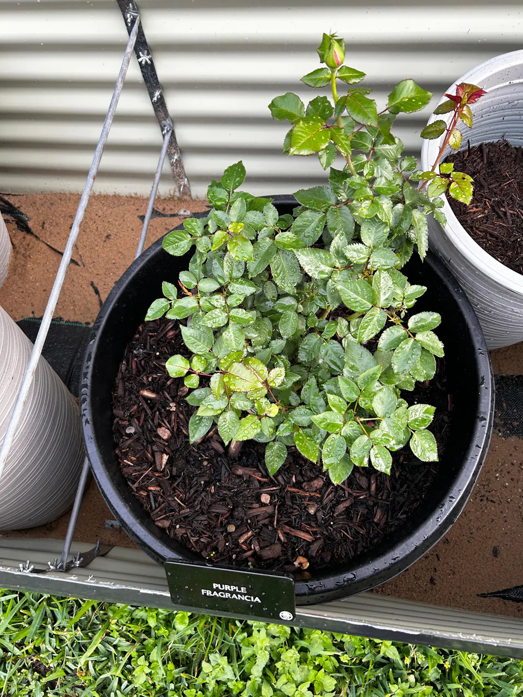 She just arrived a few weeks ago; the weather here has been cool, then hot then downpours. Typical H town, always changing, but it hasn't bothered Purple Fragrancia. She's already got a bloom coming through, is strong and healthy with no disease! She must be loving her place between Fragrant Plum and Twilight Zone. I'm new to roses and had some issues with black spot on a few of the red roses particularly. Heirloom Roses gives great videos to combat most things, so I've purchased quite a few of their products to help. Wanted to wait for the bloom to open, but will try to post again when she's a bit older. Loving the new roses!