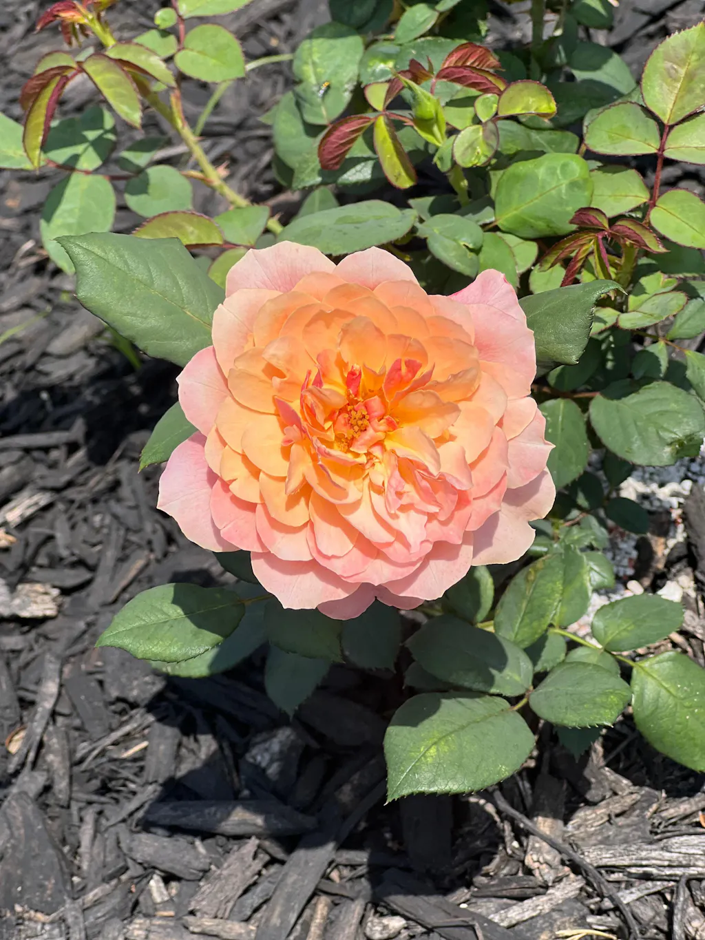 Bred in the US, this English-style rose has a compact, tidy habit, and great disease resistance. Reaching 3-4’ in height, this rounded bush will bloom in flushes throughout the season and wow with its multicolored flowers of soft apricot-gold and dark pink reverse petals. With long, strong stems and a fruity fragrance, this rose is a must-have addition to any home garden or cut flower farm. State of Grace™, with gorgeous, double blooms opening to golden centers, will welcome not only neighbors but also butterflies and pollinators to your yard.