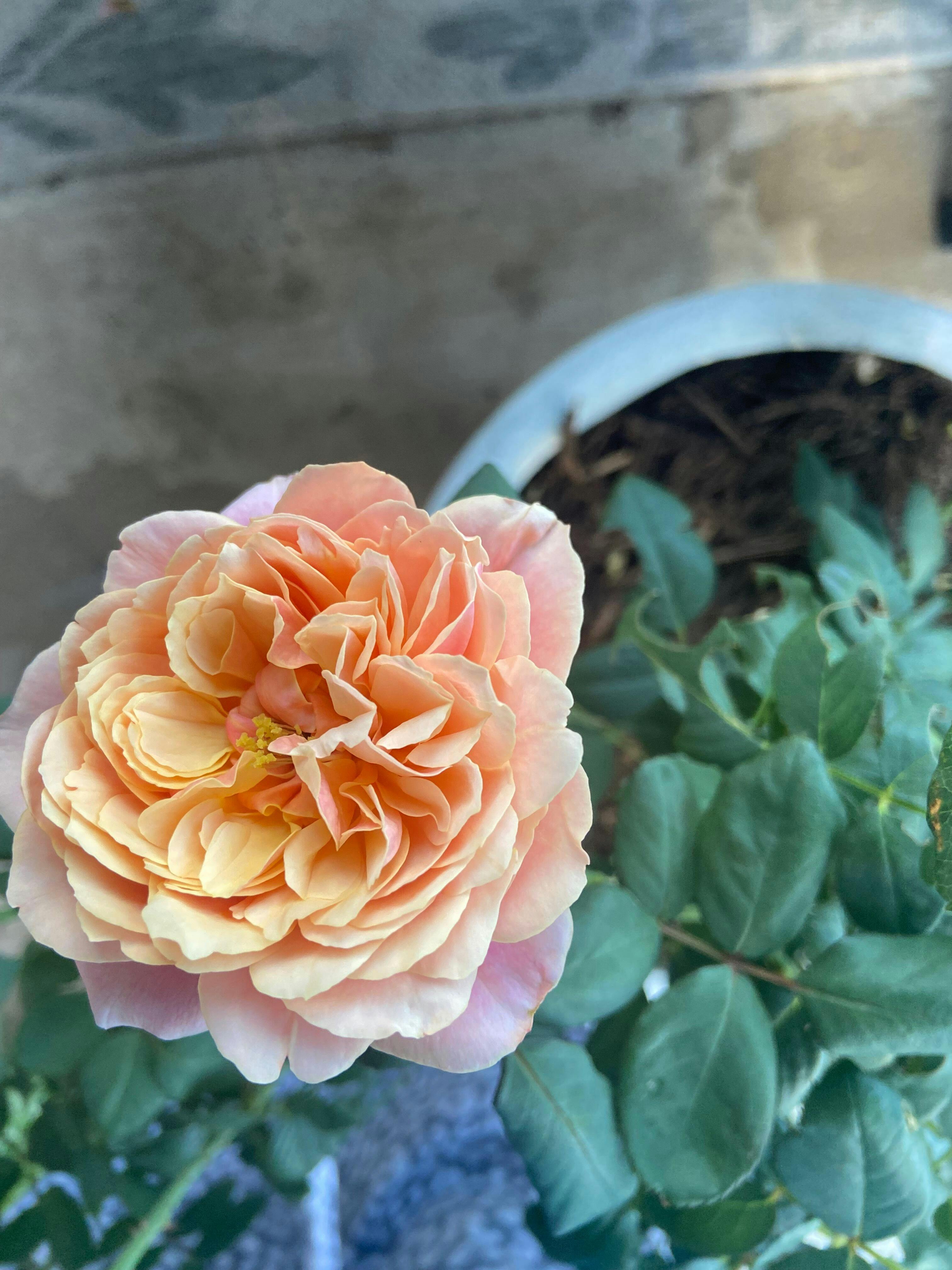 Gorgeous peach and pink blooms in only two weeks. The blooms opened this morning with no scent. By noon there was a mild fruity fragrance and bees were already visiting the blooms. I’m thrilled. This is the first rose from my order to bloom. I couldn’t decide where I wanted to plant this beauty, so I left it in the shipping pot for a week. It’s been in it’s current pot for two weeks.